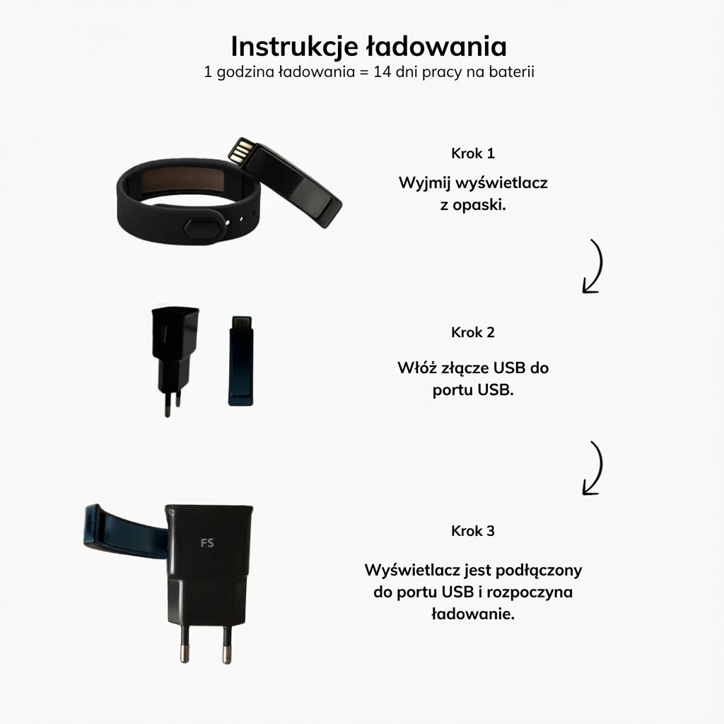 Bateria alarmu FitStart działa ponad 14 dni na jednym ładowaniu, w zależności od sposobu użytkowania, a ładowanie jest szybkie i proste dzięki złączu USB.
